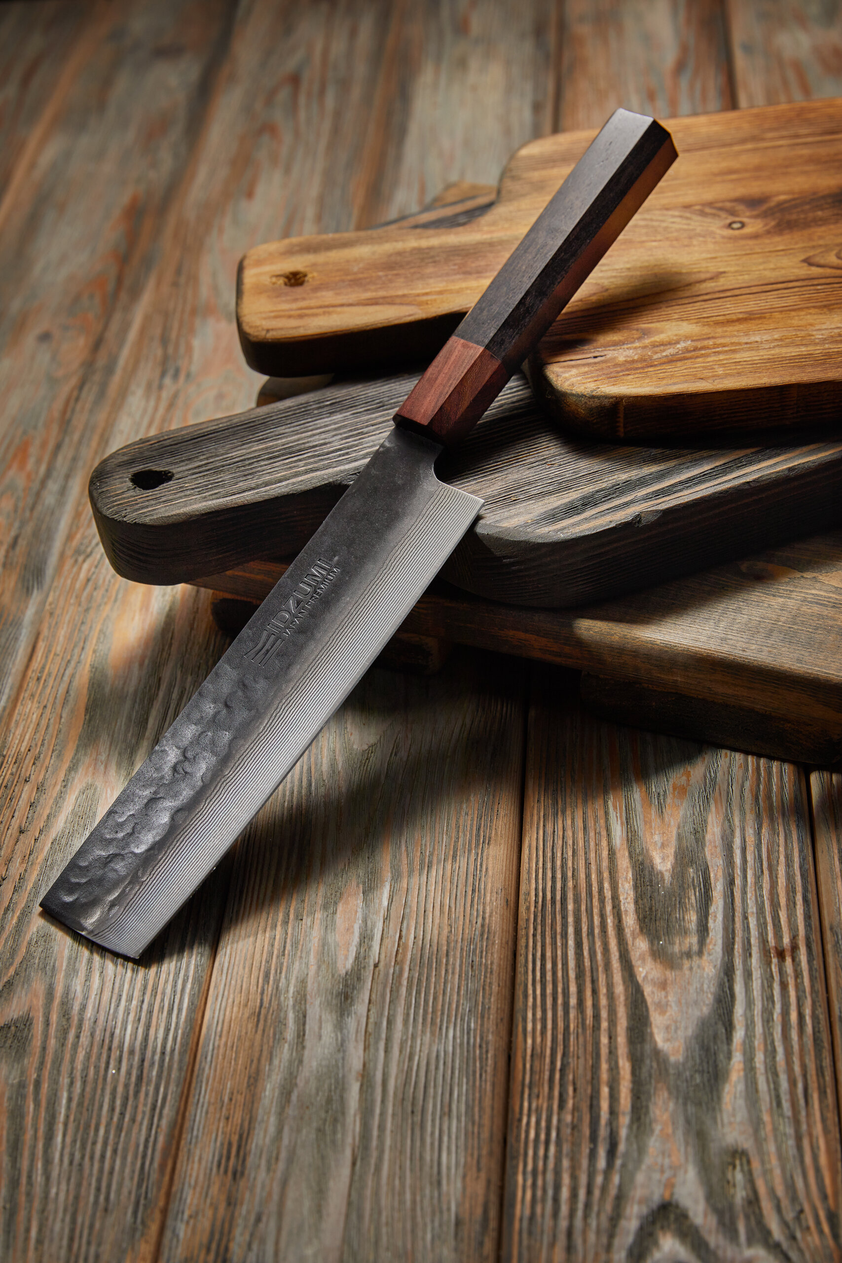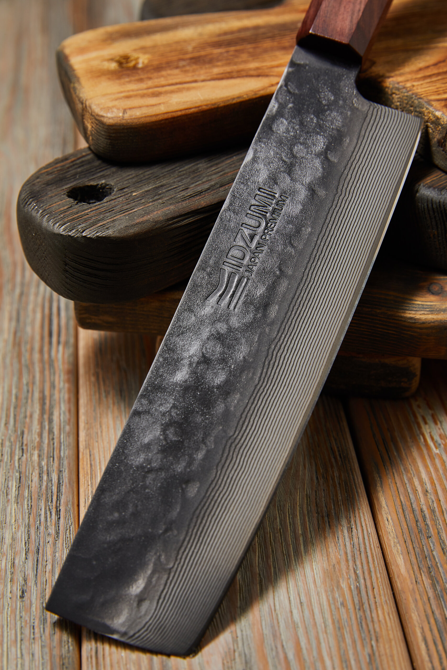 IDZUMI Нож для овощей Nakiri — профессиональный японский кухонный нож из 67-слойной дамасской стали. Плоское прямое лезвие идеально подходит для быстрых рубящих и скользящих движений при нарезке овощей и зелени. Дамасская сталь обеспечивает исключительную износостойкость и острый чистый рез, а уникальный узор на клинке придаёт ножу благородный вид.