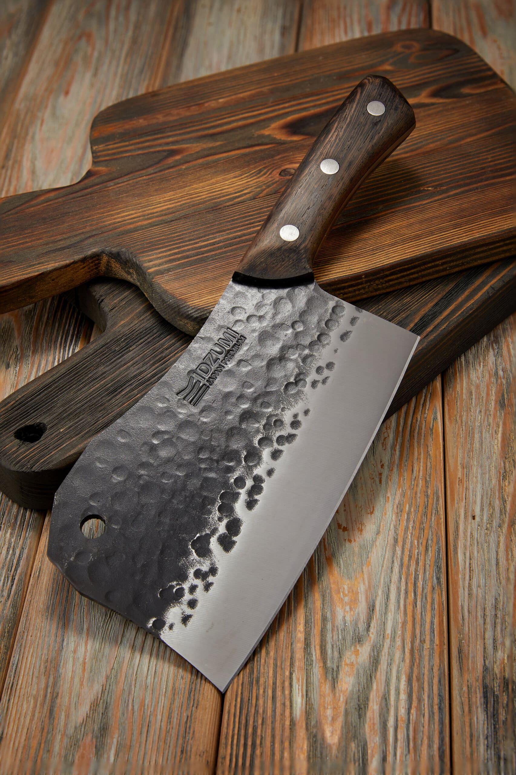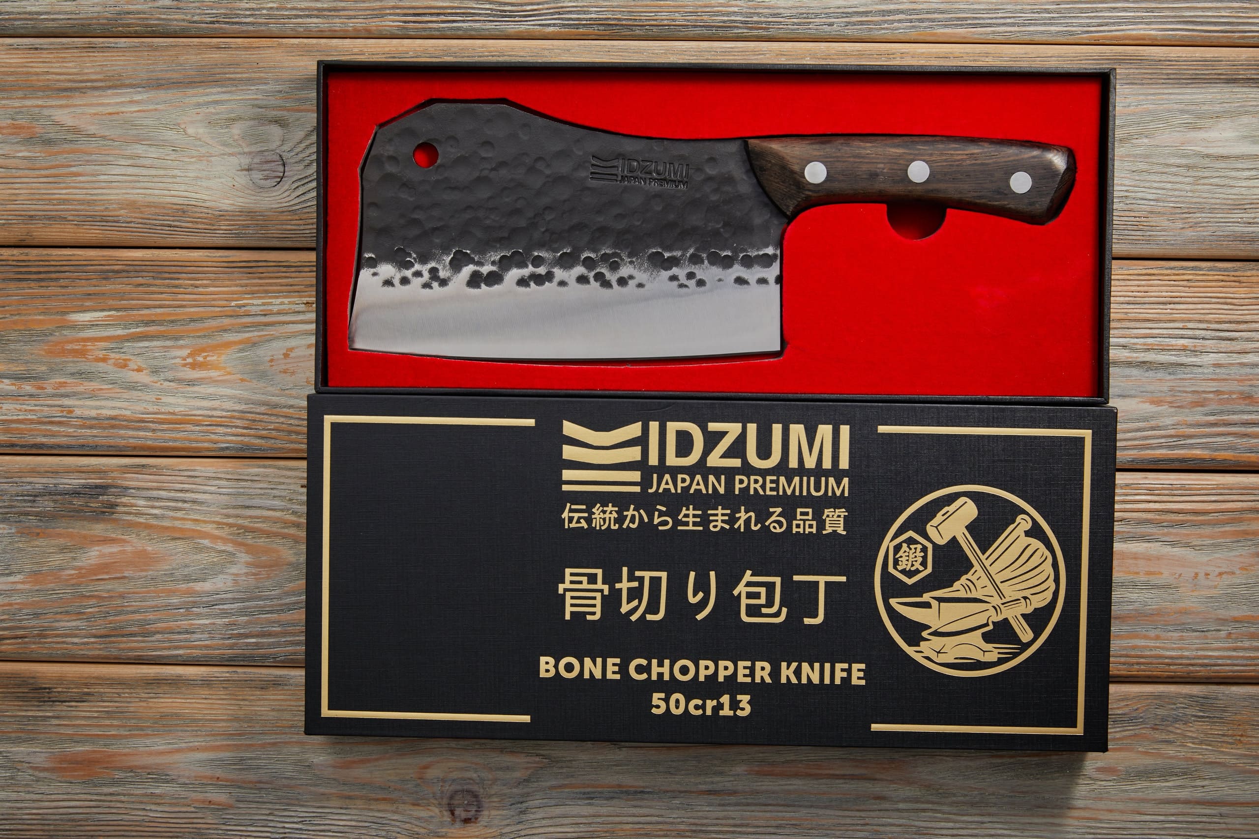 IDZUMI Нож-топорик для костей Bone Chopper — мощный японский кухонный нож из стали 50Cr13. Утолщённое и тяжёлое лезвие предназначено для рубки костей, сухожилий и замороженных продуктов. Сталь 50Cr13 обеспечивает высокую ударную вязкость — клинок не скалывается даже при серьёзных нагрузках.