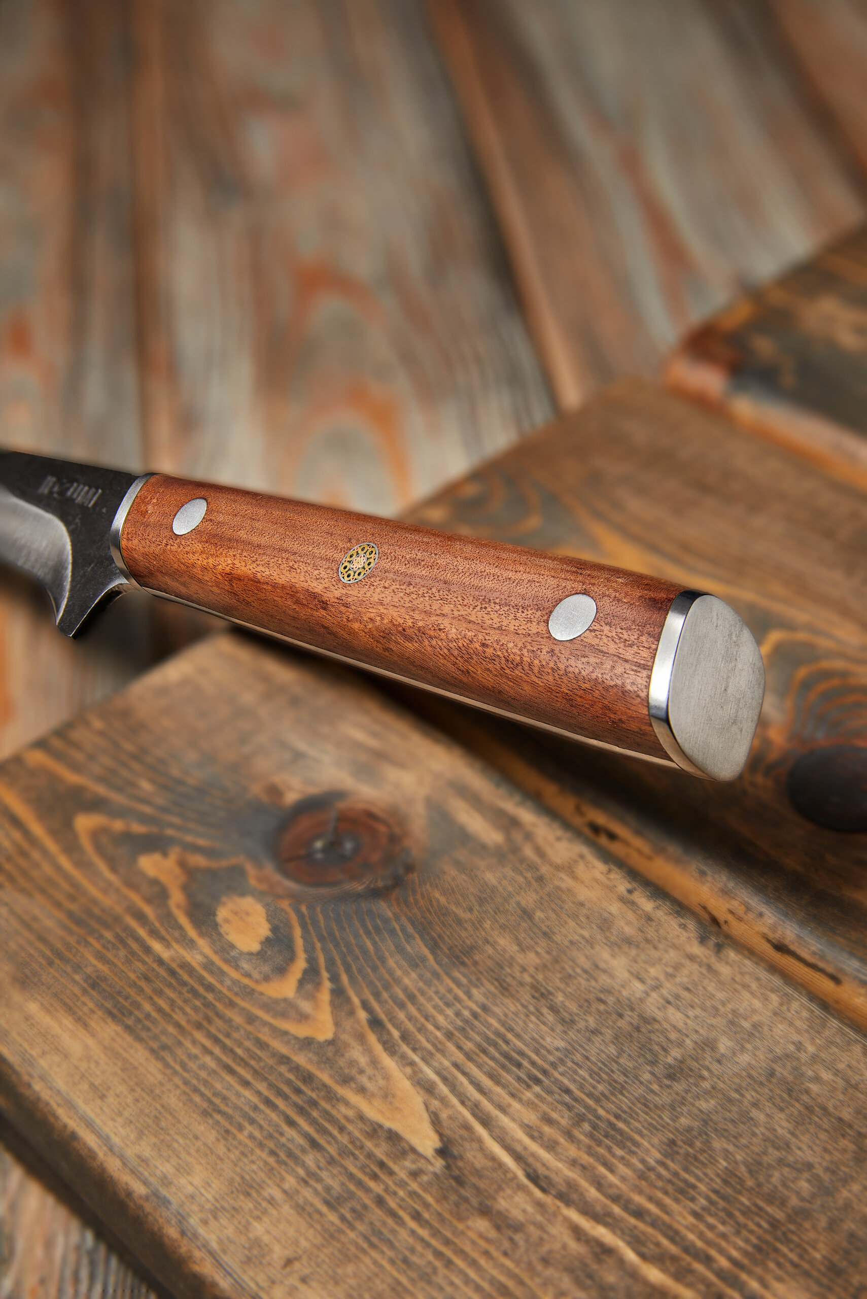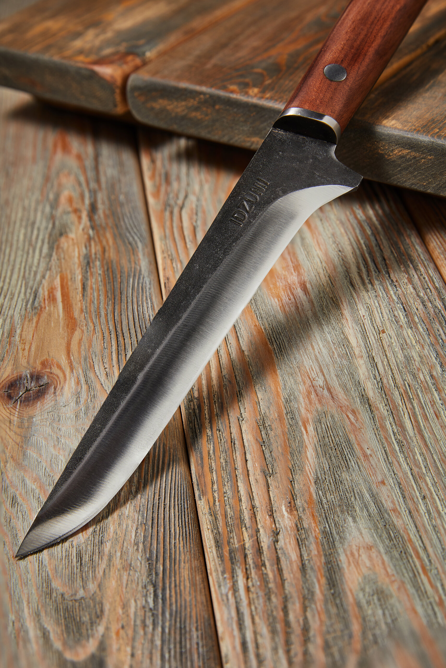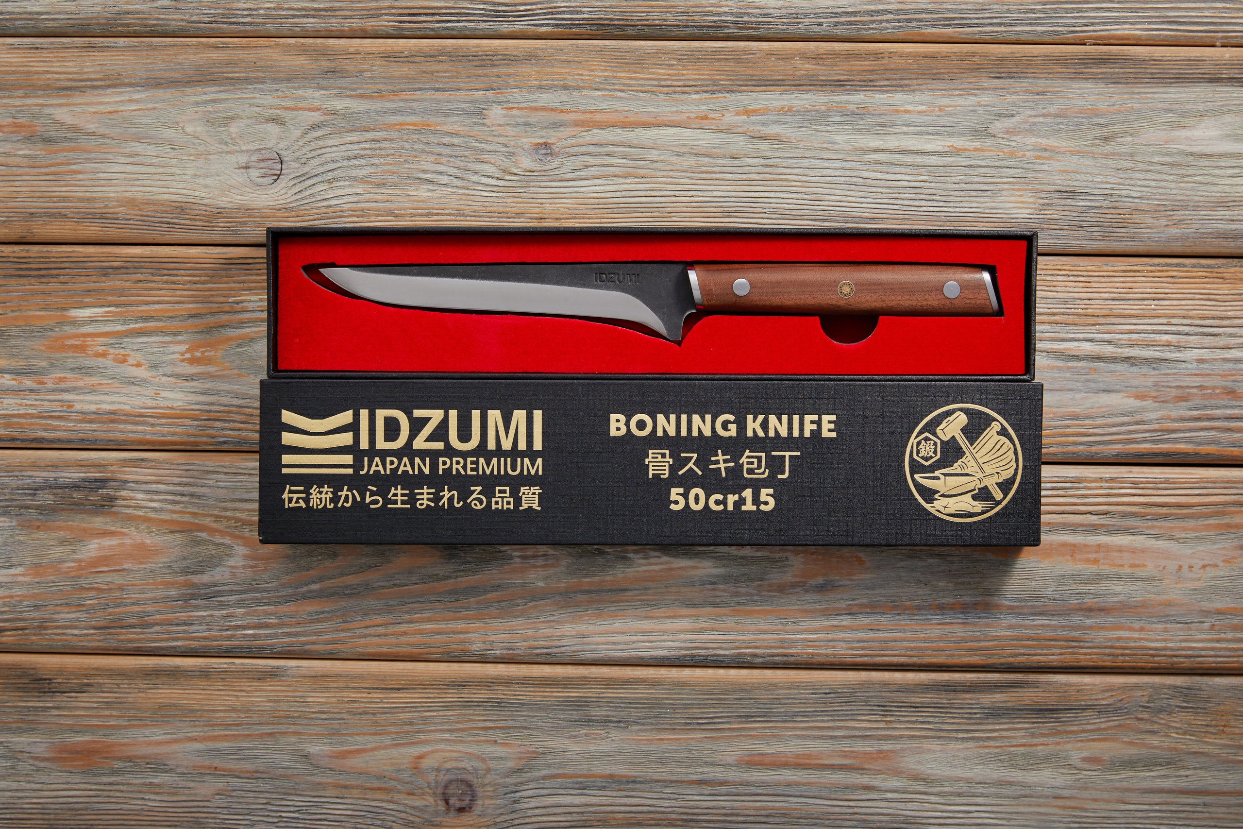 IDZUMI Обвалочный нож Boning Knife — специализированный японский кухонный нож из стали 50Cr15. Узкое гибкое лезвие идеально подходит для отделения мяса от кости, зачистки и снятия плёнки. Сталь 50Cr15 отлично держит заточку и устойчива к коррозии — надёжный инструмент для ежедневной работы с мясом.